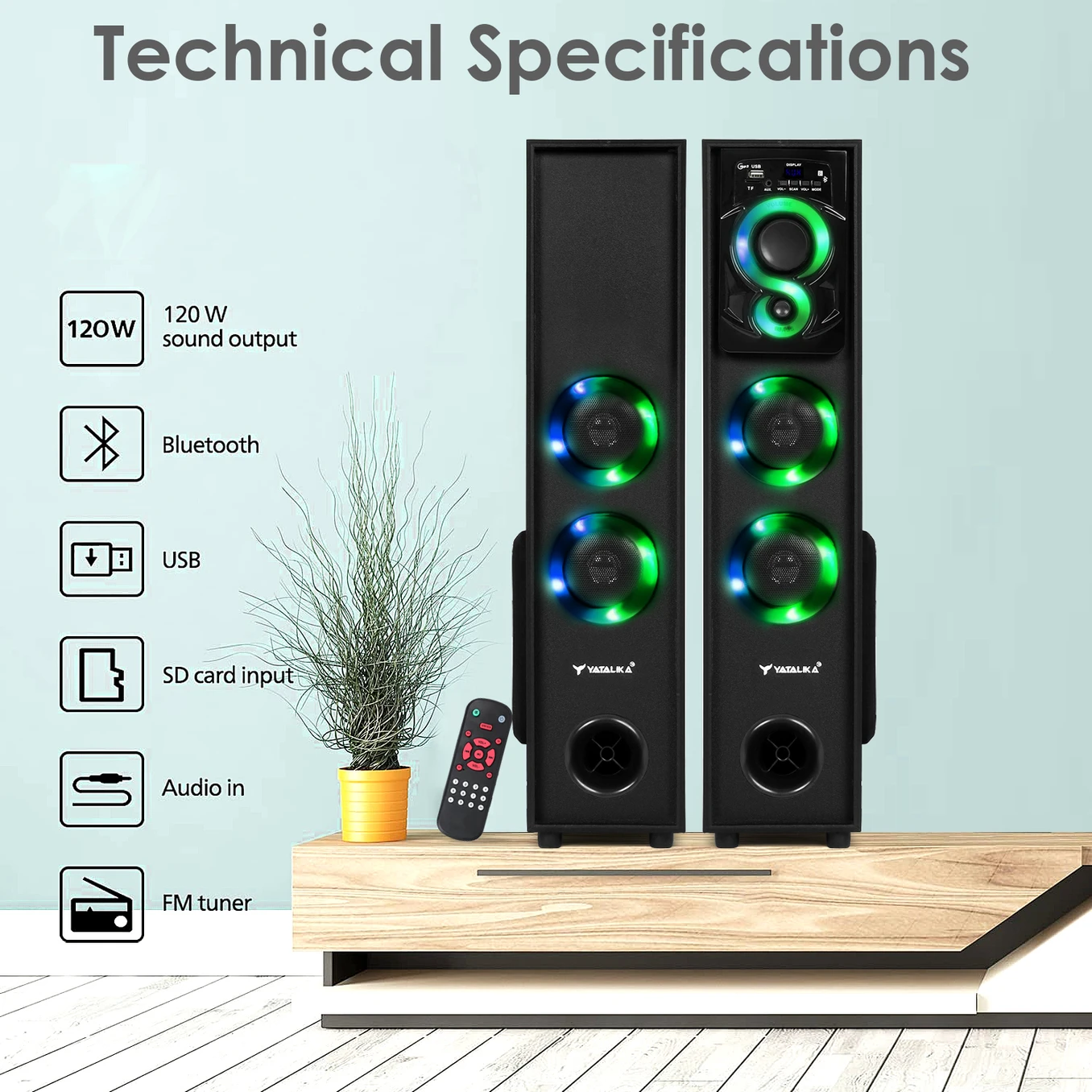 YATALIKA 180W High-Bass Tower Speaker with Bluetooth, AUX, and USB Support
